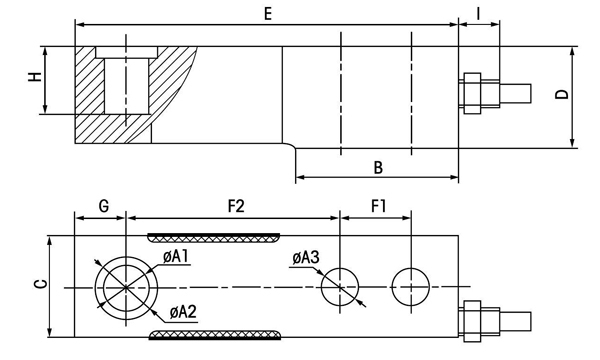 型號(hào) | 量程(kN) | 量程(t) | ΦA(chǔ)1 | ΦA(chǔ)2 | ΦA(chǔ)3 | B | C | D | E | F1 | F2 | G | H | I | J |